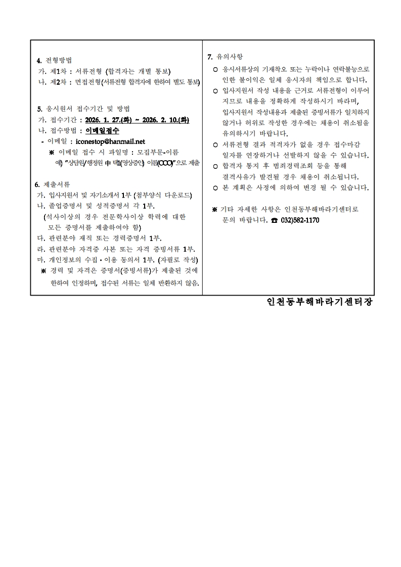 | 제목 | [공지][공지] 인천동부해바라기센터 종사자(영상증인신문) 신규채용(수습 포함) 공고 | ||||