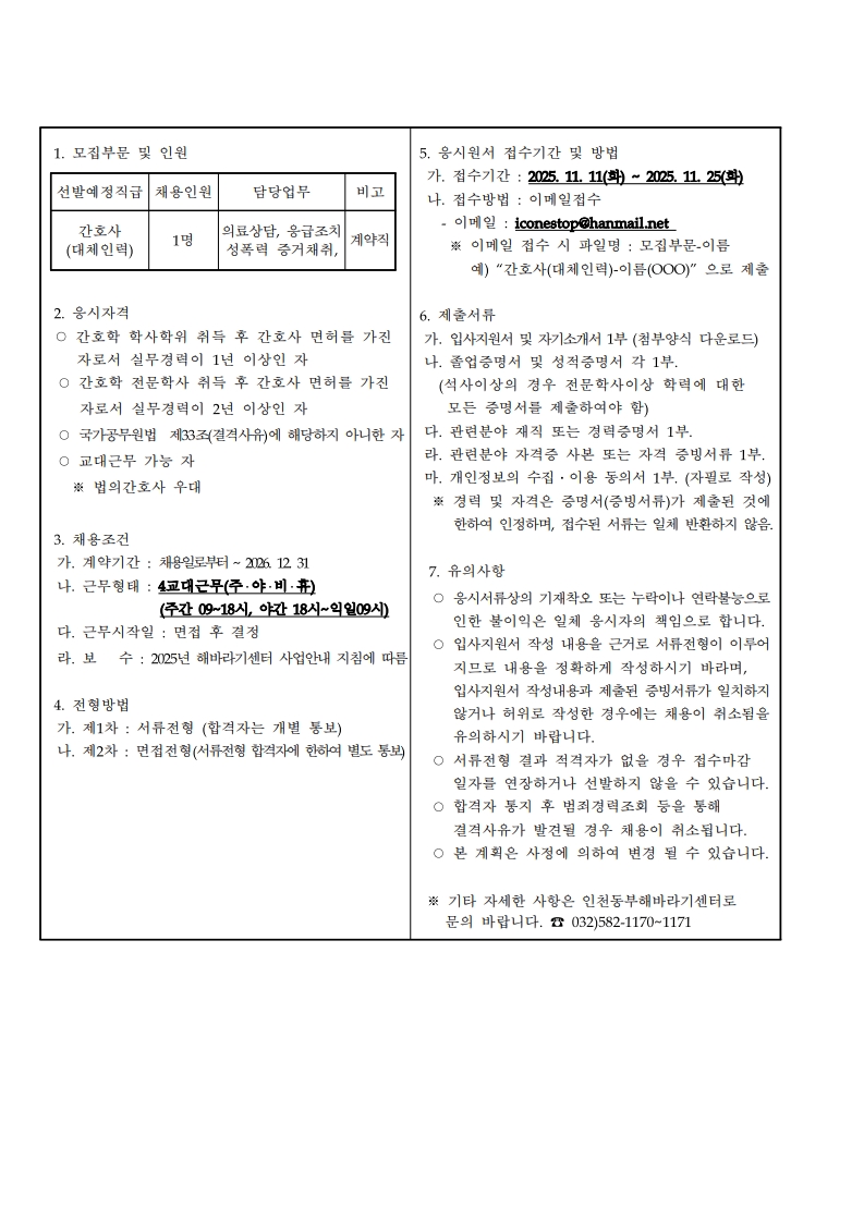 인천동부해바라기센터 종사자(간호사) 대체인력 채용 공고 계획