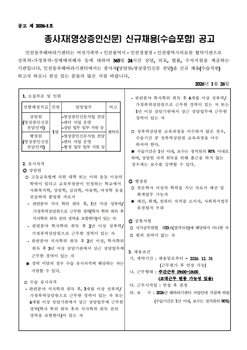 인천동부해바라기센터 종사자(영상증인신문) 신규채용(수습 포함) 공고
